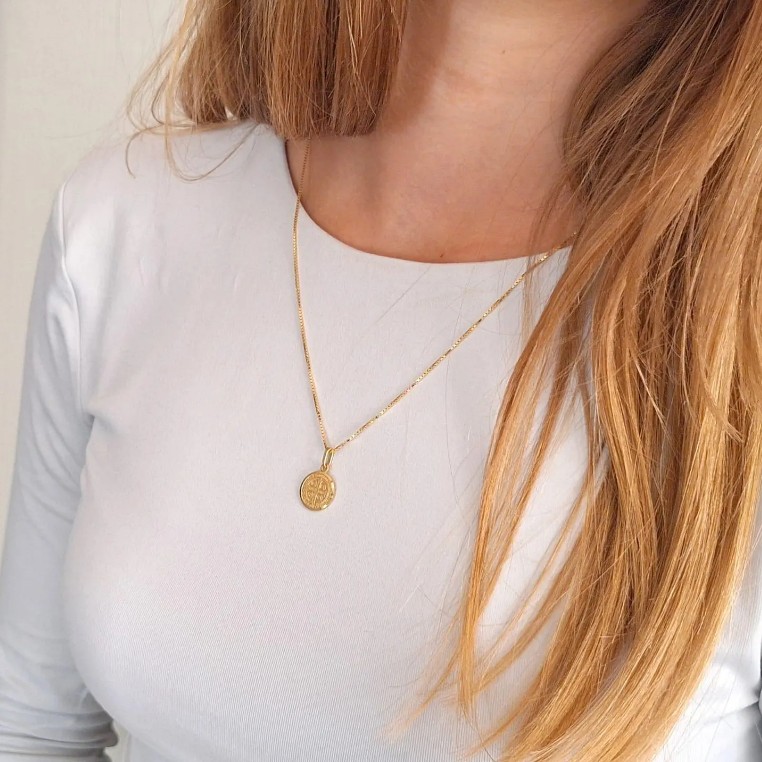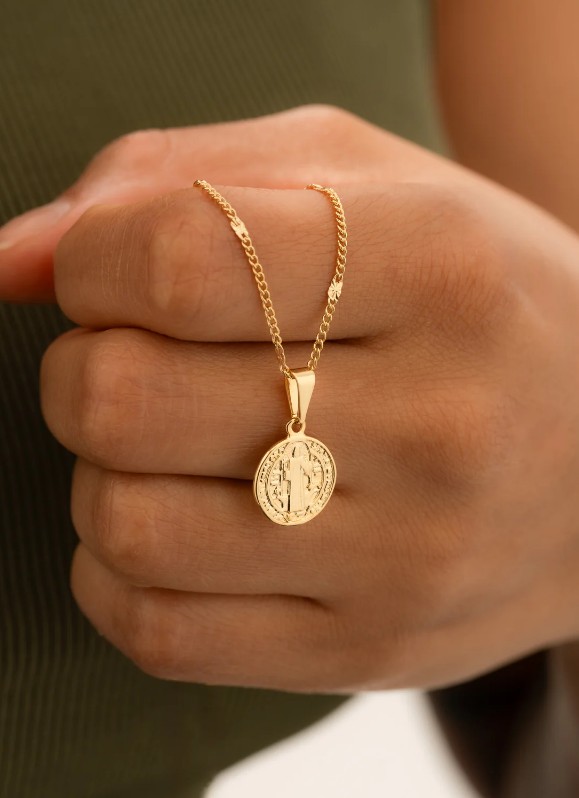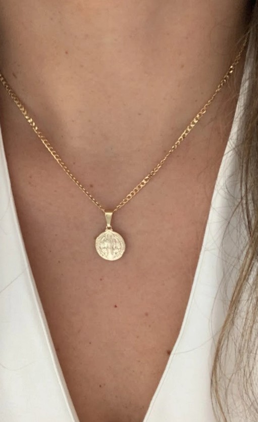 *Cadena con dije San Benito elaboradas en oro 10k